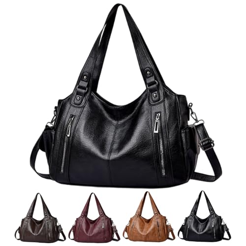 Sac à Main De Cours En Bandoulière Sac à Main Vintage Femme Cours Lycee Sac Hobo en Cuir PU avec Fermeture éclair Tout En Avec Sangle Réglable, Pour l'École Les Voyages(Black,37*12*28cm)