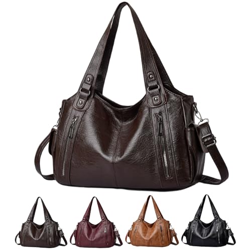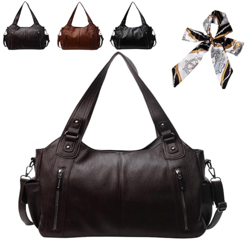 Sac à Main De Cours En Bandoulière Sac à Main Vintage Femme Cours Lycee Sac Hobo en Cuir PU avec Fermeture éclair Tout En Avec Sangle Réglable, Pour l'École Les Voyages(Coffee,37*12*28cm)
