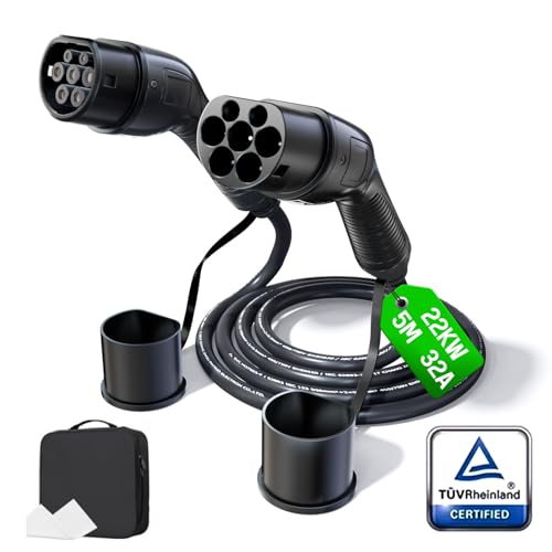 EVPEIWE 22KW 32A Type 2 Câble de Recharge Voiture Electrique| Triphasé | 5 Mètres |Type 2 à Type 2 Câble de Chargeur pour EV/PHEV pour Model S/X/Y/3 avec Sac de Transport, Certification CE TÜV IP55