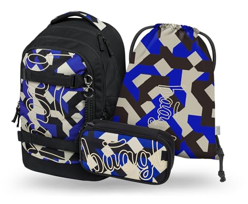 Baagl Ensemble de 5 sacs à dos d'écolier pour garçons, filles, adolescents (skateboard, sac à dos skate MAX, trousse, sac de gym, sac de sport, sac banane), cartable ergonomique, 30 l, Duo, L