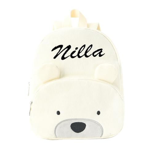 Personnalisable Sac a Dos Enfant, Broderie Petit Sac à Dos Bebe, Personnalisé Prenom Brodé Cartable Sac a Dos Enfant Maternelle Fille & Garcon, Velours Côtelé Ours Sac à Dos Ecole Crèche (Blanc)