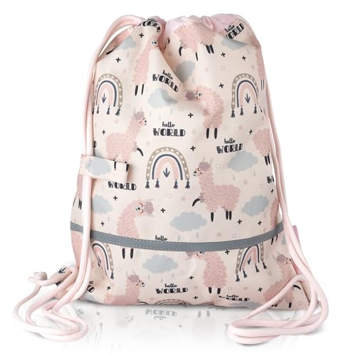 TA Trend Atelier Sac de gym enfant maternelle en polyester recyclé – imperméable, sans PFC, avec réflecteurs et sangle poitrine (Lama-Rose)