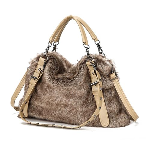 Extolove Sac à main d'hiver en fourrure pour femme, sac fourre-tout pelucheux, sac à main en fausse fourrure, sac à bandoulière moelleux, café, Medium