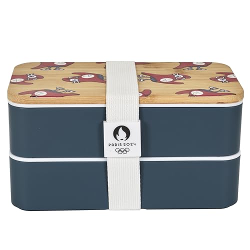 PARIS 2024 - CJO3350 Lunch Box 2 Niveaux Bande Élastique Mascotte - Conçu pour Repas Organisés - Compartiments Séparés - Sac Isotherme Inclus - Dimensions 18.5 x 10.5 x 9.7 cm