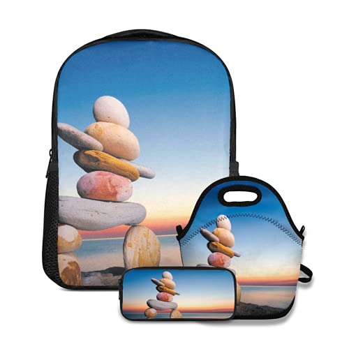 Ensemble de sac à dos d'école,Figure d'inukshuk sur la côte contre le coucher du soleil,avec sac à lunch et étui à crayons pour cartable d'adolescent