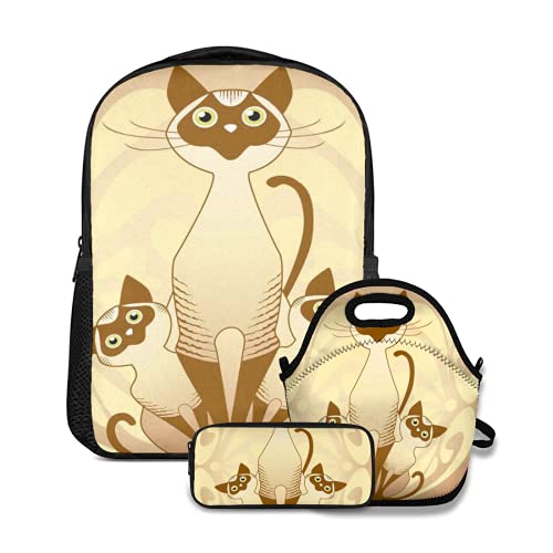 Ensemble de Sacs à Dos pour l'école,Trois Chatons félin Chats Siamois Familly asiatiques Enfants avec Fond Ivy,avec Sac à Lunch et Trousse à Dos pour Adolescents