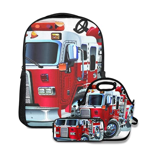 Ensemble de sac à dos d'école,Aide d'urgence de véhicule de pompiers pour le camion à thème de transport de pompier public,avec sac à lunch et étui à crayons pour cartable d'adolescent