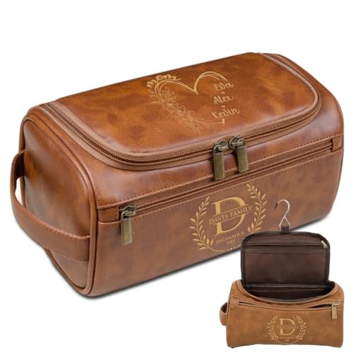 Trousse de Toilette en Cuir personnalisée pour Hommes, kit Dopp Cadeaux personnalisés avec Crochet, Sac de Voyage Monogramme de nom gravé au Laser avec poignée latérale (Style 1)