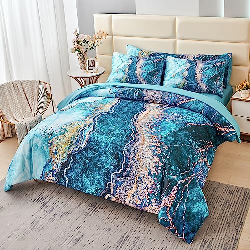 PERFEMET Parure de lit 6 pièces avec Couette en Forme de marbre Bleu Sarcelle et doré – Motif Aquarelle – Style Artistique rétro – Lit dans Un Sac – Grand lit (Bleu Sarcelle)