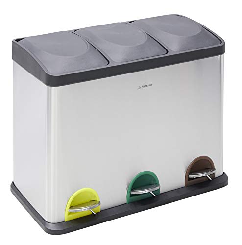 ARREGUI Step Bin CR705-45L Poubelle de Recyclage Cuisine 3 Bacs à pédale | 3x 15 L (45 L) | Poubelle de Tri Sélectif avec 3 Rangements | Meuble Poubelle en Acier Inoxydable avec 3 Seaux | Sac poubelle