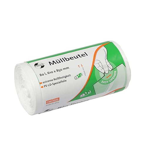 DEISS FIRST PLUS Sac Poubelle 80L – 610×850 mm, Blanc, LDPE Recyclable, Ultra Résistant avec Easy Opener – Rouleau de 50 Sacs