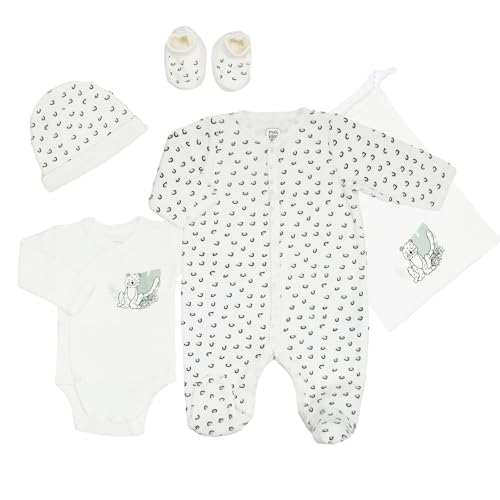 Trois Kilos Sept - Kit Naissance - Vêtements Bébé - 5 Pièces (Chaussons Naissance, Pyjama, Body, Bonnet et Sac de Rangement) - Velours Blanc - 0 Mois - Motif Leopard