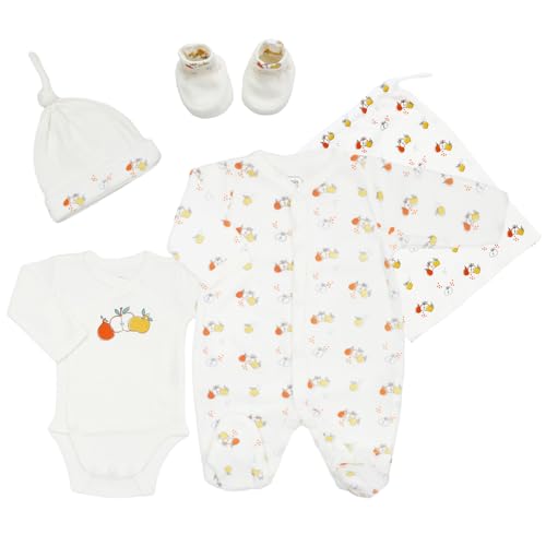 Trois Kilos Sept - Kit Naissance Pommes - 5 Pièces - 1 mois - Velours Blanc - Motif Pommes (chaussons naissance, pyjama, body, bonnet et sac de rangement)
