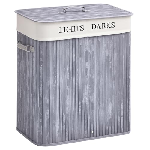 HOMCOM Panier à linge 100L avec 2 bacs bambou pliable couvercle poignée sac amovible en toile gris