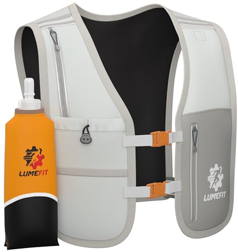LUMEFIT Gilet Running - Gilet Réfléchissant & Sac à Dos Réglable avec Porte-Téléphone, Pochette Imperméable & Gourde 500ml - pour Homme et Femme, Idéal Course à Pied & Trail