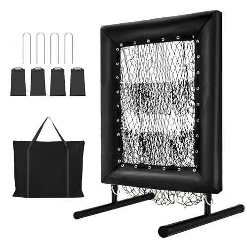 GarveeLife Filet de Lancer de Baseball, 9 Trous, avec Zone de Frappe et 5 Niveaux de Hauteur réglable, Portable, pour Exercices de Frappe et 4 piquets et Sacs de Sable