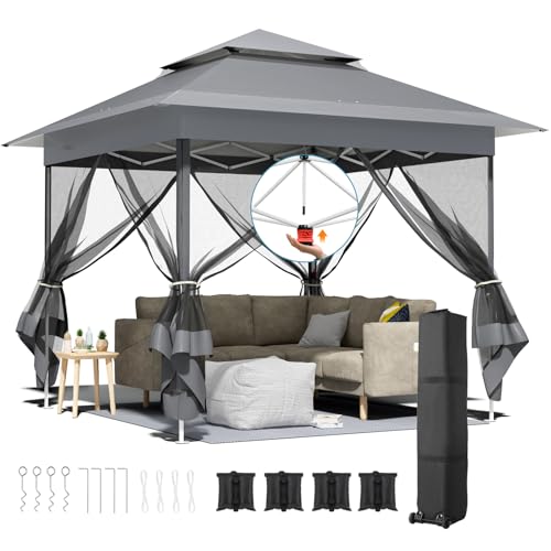Tonnelle Pliante 3,3 x 3,3 imperméable,avec 4 Toiles Moustiquaires, One Push Tonnelle de Jardin,Tente de fête à Double Toit, 4 PCS Sacs de Sable, pour terrasse/marché/Camping/Plage, Gris Foncé