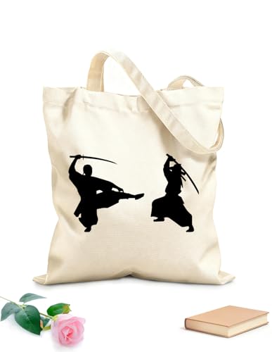 AILOONG Sacs femme en toile de coton silhouette de samouraï armé d'un sabre et d'un katana japonais tissu épais de 340g/m² Matière douce pour la peau