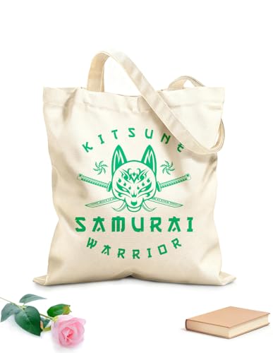 XIARON Sacs femme en calicot kit'sune et croix katana samouraï shuriken tête logo de loup japonais dans un style vintage et tissu épais de 340g/m² Pliable M Vert bleuâtre