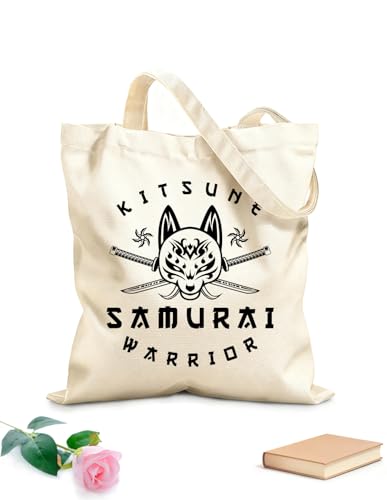 XIARON Sacs femme en calicot kit'sune et croix katana samouraï shuriken tête logo de loup japonais dans un style vintage et tissu épais de 340g/m² Pliable L Noir