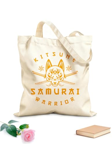 XIARON Sacs femme en calicot kit'sune et croix katana samouraï shuriken tête logo de loup japonais dans un style vintage et tissu épais de 340g/m² Pliable M Jaune moutarde