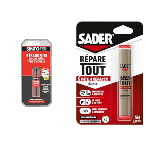 SINTO Répare Vite Spécial Métal - 60g - Répare, Rebouche, Assemble et Soude & Sader Répare Tout - Pâte à Réparer Epoxy - Tous Matériaux – Intérieur/Extérieur – Couleur : Gris – 1 Tube 57 g
