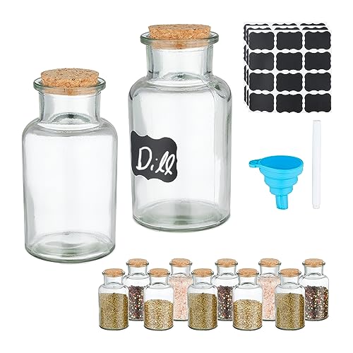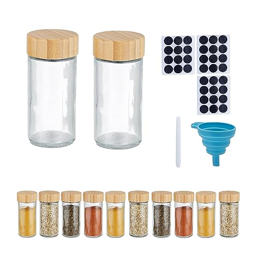 Relaxdays Salière et poivrière, Couvercle, Lot de 12, 250 ML chacun, étiquettes, marqueur, Entonnoir, Transparent