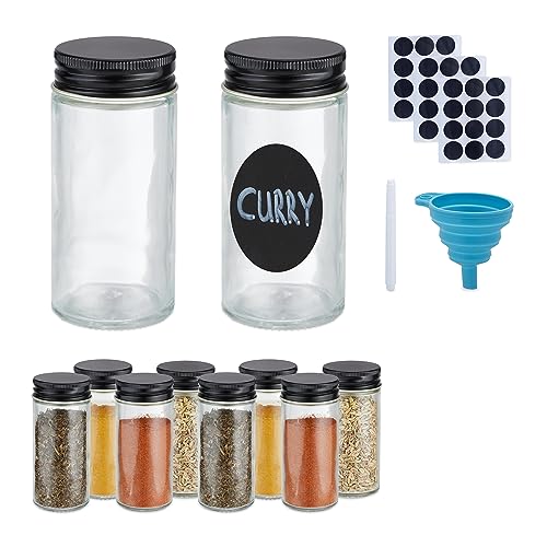Relaxdays Salière et poivrière, Set de 10, Embout tamiseur, étiquettes, marqueur, Entonnoir, Transparent/Noir