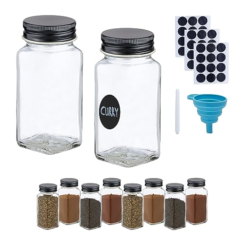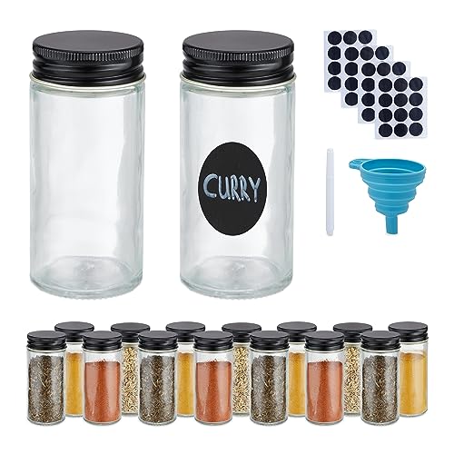 Relaxdays Salière et poivrière, Set de 16, Embout tamiseur, étiquettes, marqueur, Entonnoir, Transparent et Noir