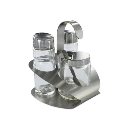 Fackelmann 46652 Ensemble pour sel et poivre et moutarde, set salière et poivrière, moutardier, salière, poivrier, Acier inoxydable, Verre, 8,5 x 3 cm, Inox, Transparent