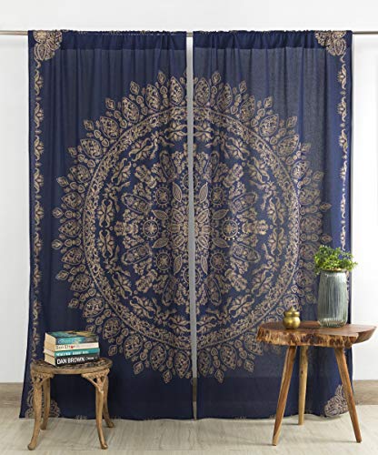 Popular Handicrafts Rideau de fenêtre Indien Hippie Mandala bohème Bleu doré pour Chambre à Coucher, Salon, Balcon
