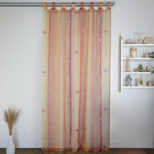 Home Maison - Voilage à Pattes Coloré et Fleuri - Polyester - Motif Fleurs sur Rayures Verticales - Prêt-à-Poser pour Salon Chambre Cuisine - Transparent Tamisant - 140 x 240 cm - Orange