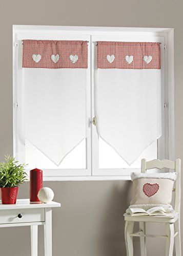 Home Maison - Paire de Petits Voilages en Étamine avec Parement Vichy - Polyester - Ourlet Passe Tringle - Appliques Cœur en Fausse Fourrure - Fenêtre Salon Chambre Cuisine - 60 x 120 cm - Blanc