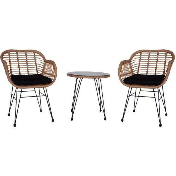 Salon de jardin- -une table et deux fauteuils osier coussin Noir - résine tressée