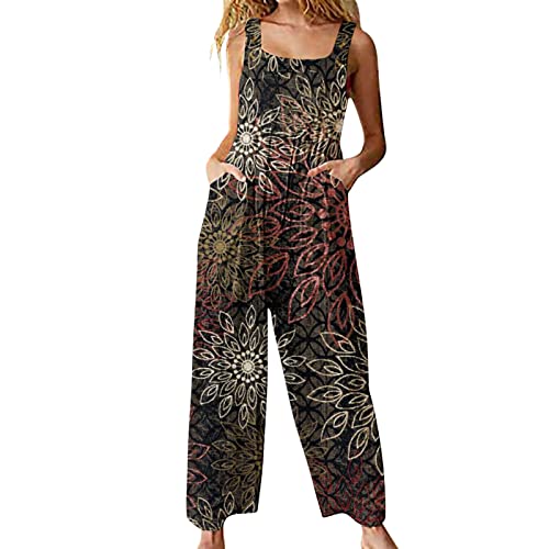 Pantalon Combinaison à Bretelles Été Femme Chic Grande Taille Salopette Ample Imprimé Vintage Style Ethnique Rétro Patchwork Jumpsuit Playsuit Combishorts Overalls Rompers Décontractées pour Dames