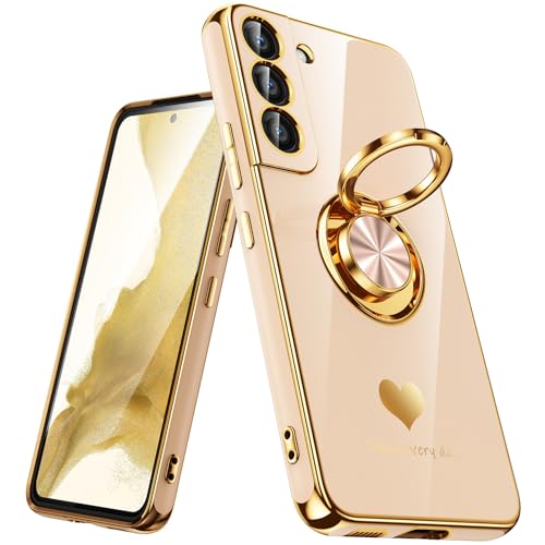 Nonional Étui Fin et Souple pour Samsung Galaxy S22 5G, Anneau Rotatif à 360°, Motif cœurs de Luxe, Bord doré, Rose