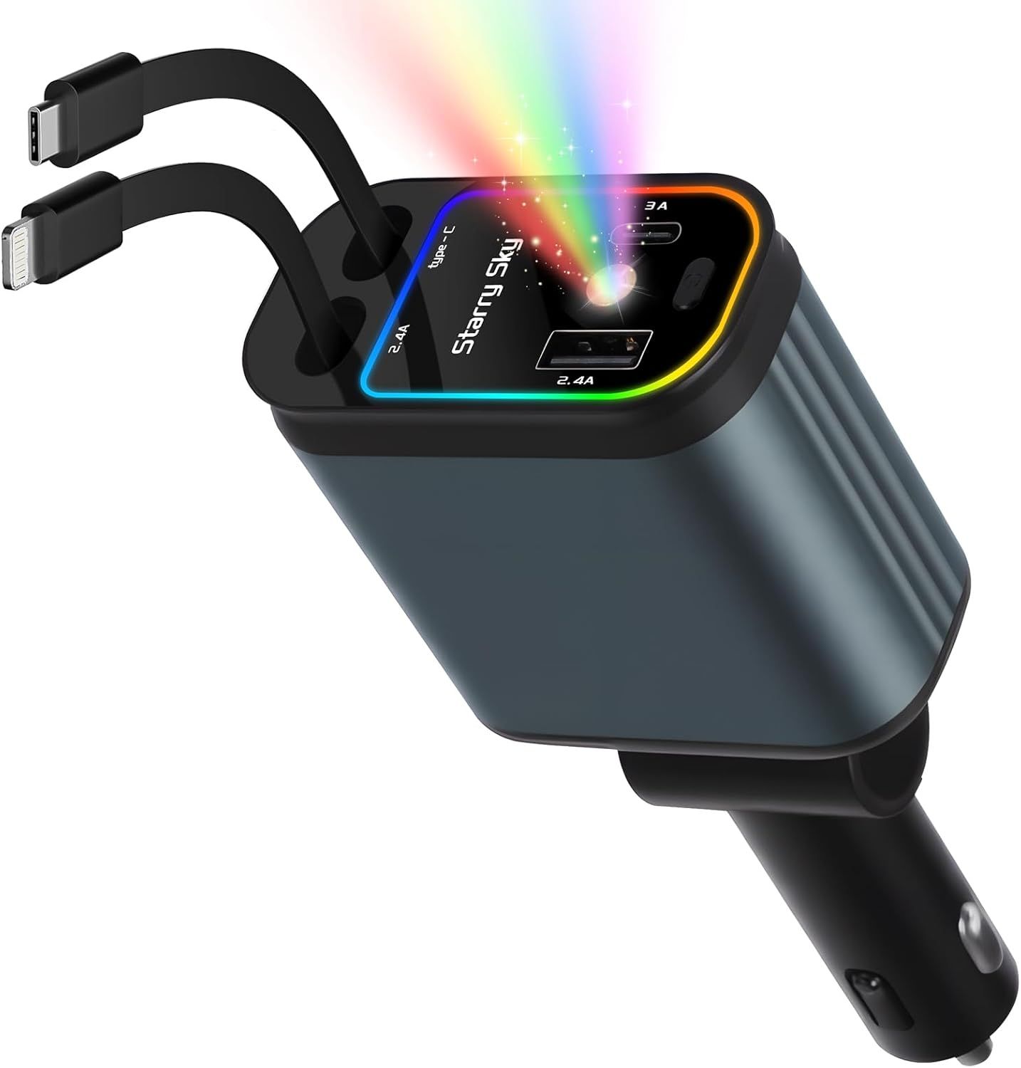 Chargeur de voiture rétractable 4 en 1, chargeur de téléphone pour voitures PLDHPRO 80 W avec câble USB-C et iOS 12 V/24 V, compatible avec iPhone 16/15/14/13/12 Sam SungGalaxys25/S24/S23 Pixel i Pad