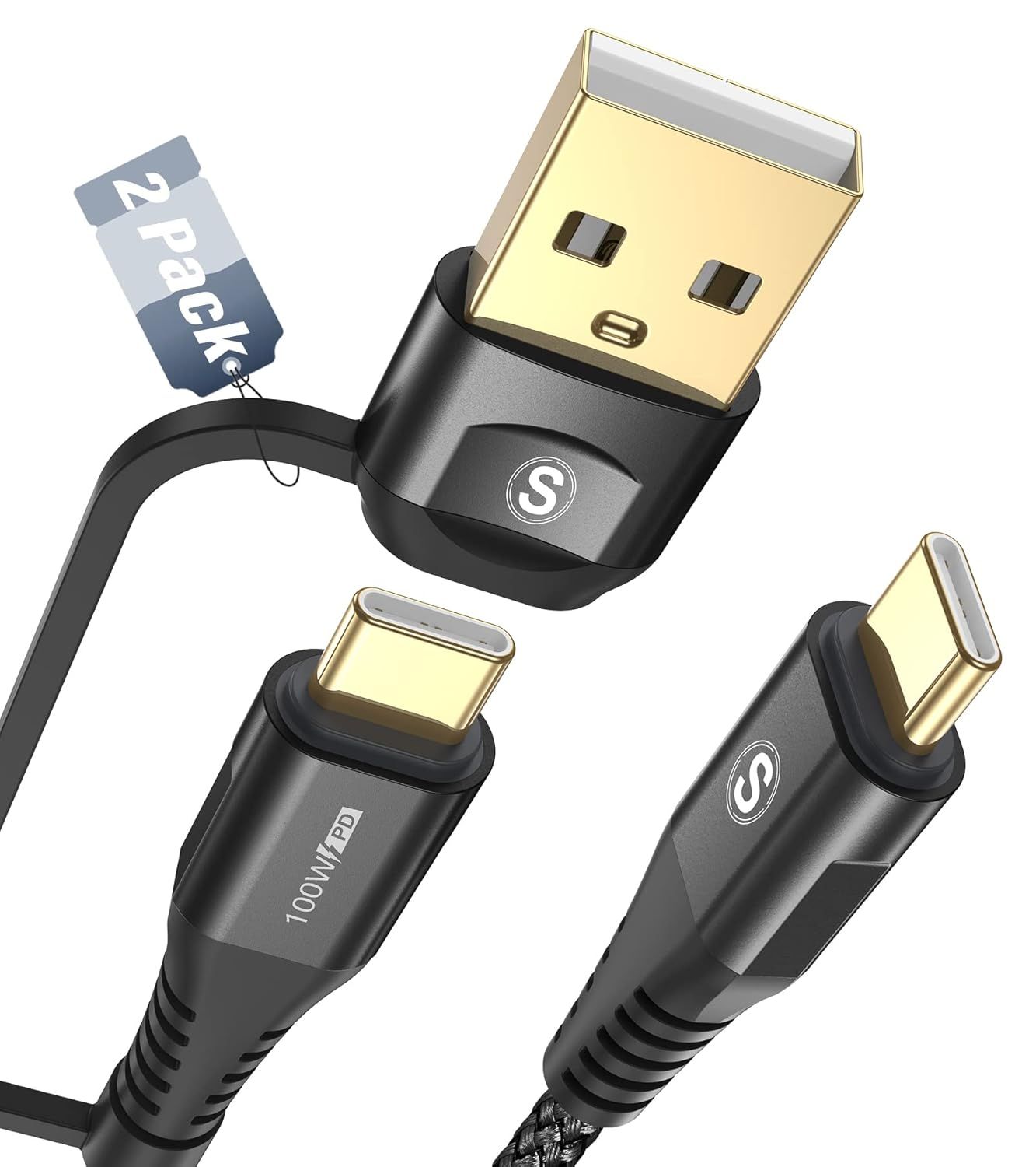 KAL-Câble multi USB C 100W [2 pièces 2m], 2 en 1 5A PD QC Câble charge rapide Câble multi USB A/USB C vers USB C pour iPhone 15/ iPhone 16, MacBook Pro/iPad Pro, sam sung Galaxy S24 S23 S22 S21 S10