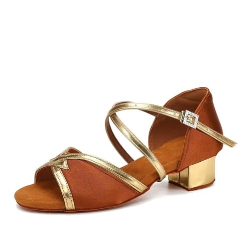 Chaussures de Danse Latine for Enfants, Semelle Souple, Talon carré, Satin, Paillettes, Sandales for Femme, Cha Samba Tango(Brown S 3.5cm,36)