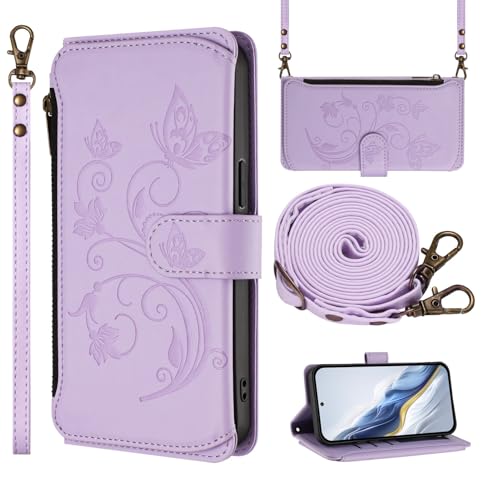 SLLMYYX Étui portefeuille pour Samsung Galaxy A34 5G 6,6", étui de protection à rabat en similicuir PU avec 5 emplacements pour cartes, poche zippée, dragonne, bandoulière, lavande