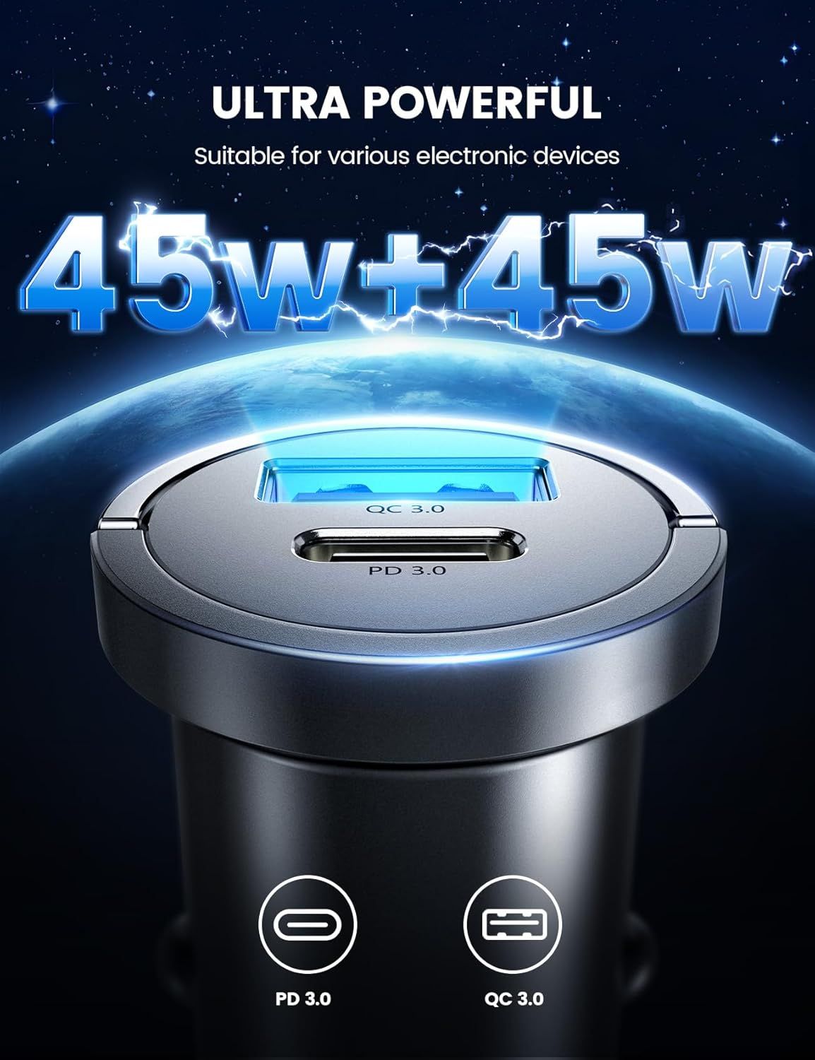 Car Charger, Car Cigarette Lighter Charger ¿ [USB C 45W + USB A 45W] Compact & Invisible Zinc Alloy Design, 12V Car Cigarette Lighter Socket for iPhone 16/15/14, iPad, Samsung