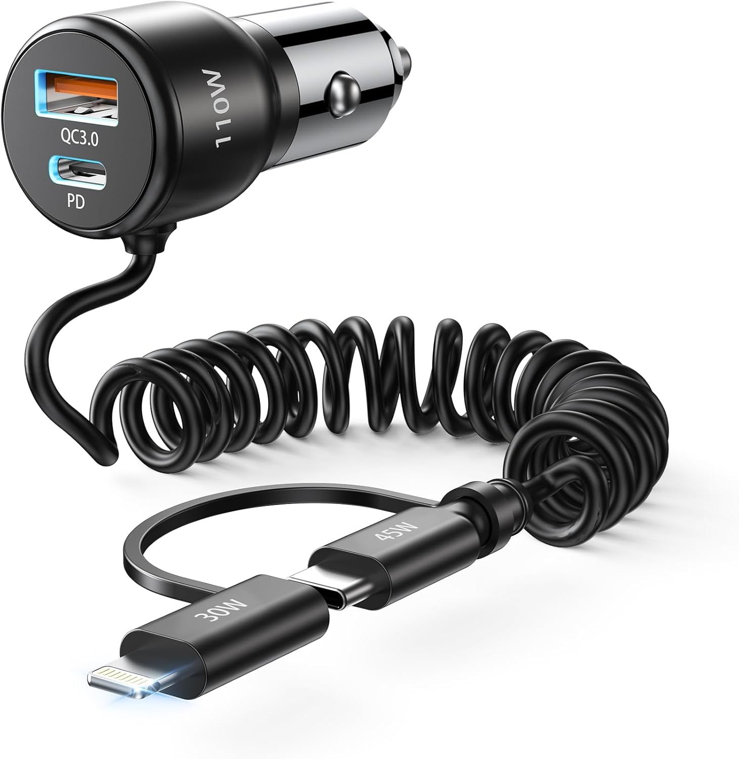 Car Charger Fast Charge 110W Total USB C 65W & USB A 45W with 5ft Spiral C and L Car Cigarette Lighter Charger Cable for iPhone 16 15 14 13 12 11Pro Max Mini Samsung S22 S21 Note Pixel