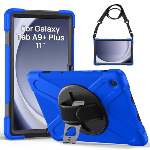 Gerutek Coque Antichoc pour Samsung Galaxy Tab A9 Plus 11" 2023 (SM-X210/X216/X218), Étui Armure Robuste avec Support Rotatif, Dragonne et Bandoulière Réglable, Housse pour Samsung Tab A9+ Plus, Bleu