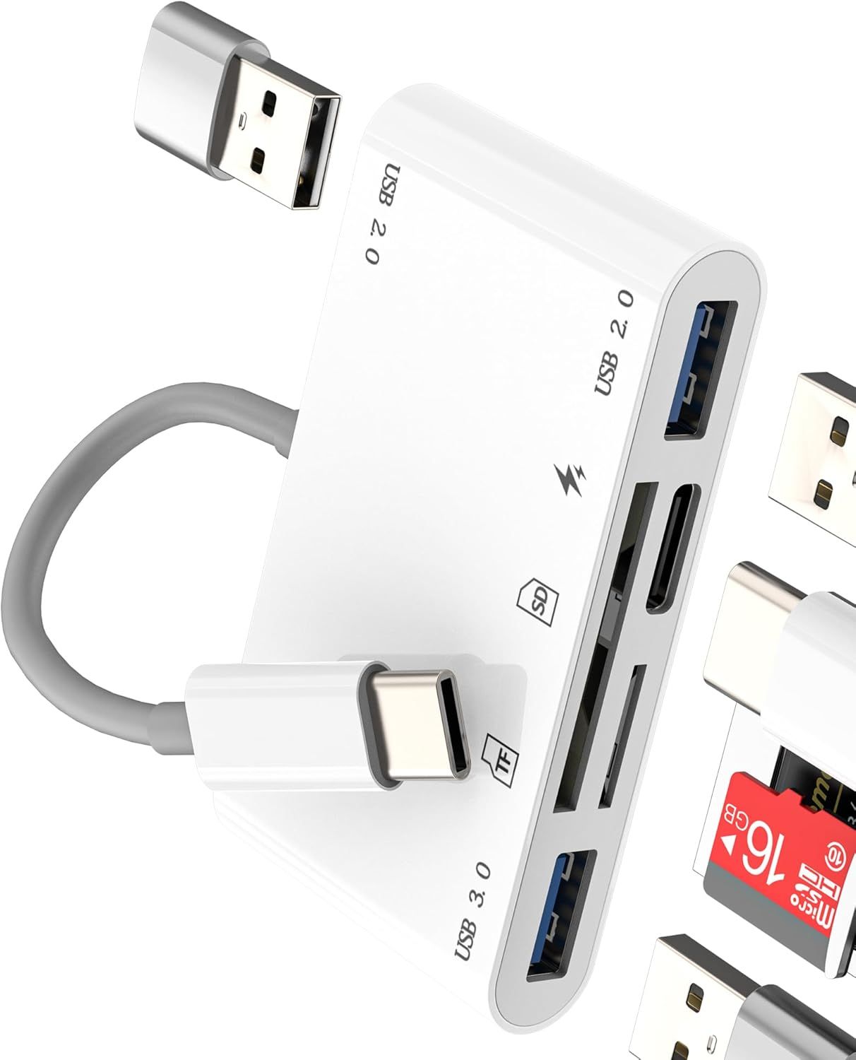 Adaptateur USB-A Lightning USB C(5en1)SD Micro SD Lecteur Carte USB Adapter Pour iphone 16 15 14 Pro Pour ipad Compatible Avec Samsung S24 S23 USB Clé Mémoire OTG 3.0 Type C Multiport Reader Portable