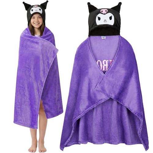 Hello Kitty Sanrio Couverture à Capuche Fille et Ado, Kuromi Cinnamoroll Plaid Polaire Chaud et Doux pour se Blottir, Kawaii Cadeau Anime (Violet Kuromi)