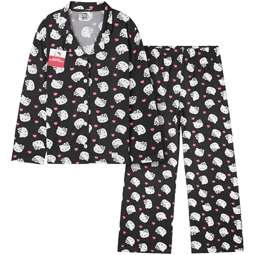 Hello Kitty Sanrio Pyjama Fille et Ado, Ensemble Haut et Bas, Tenue de Nuit Enfant Kawaii, Pyjama Hiver Doux et Confortable (9-10 Ans, Noir Hello Kitty)