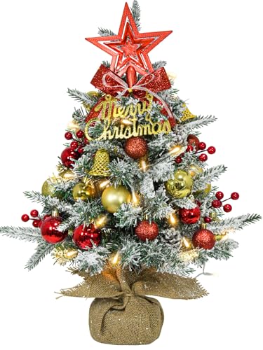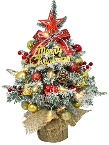 Mini Sapin de Noël Artificiel avec Lumineux LED, 60cm Petit Arbre de Noël Décoré avec Ornements, Mini Arbre de Noël pour Décoration de Table Bureau Interieur