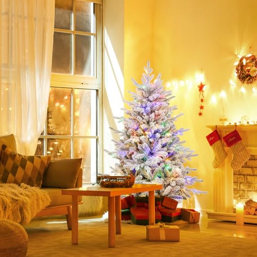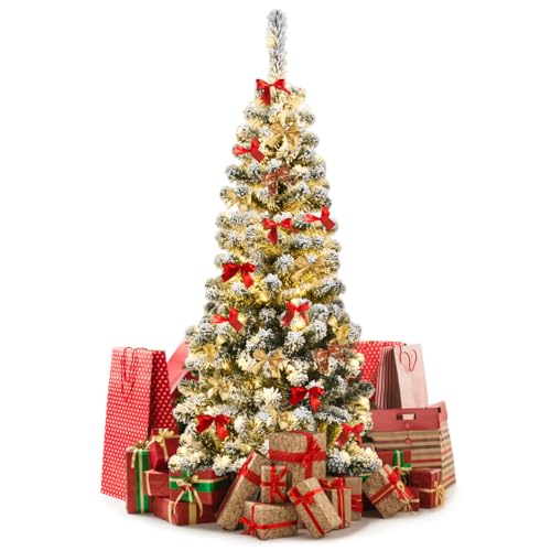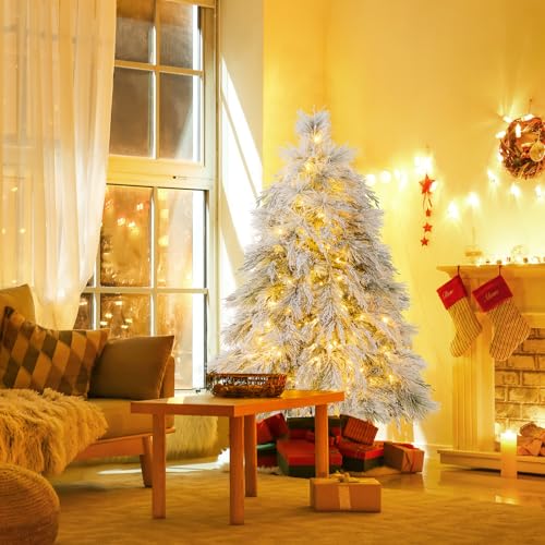 GOPLUS 140CM Sapin Noel Lumineux avec 200 LED, Sapin de Noel Artificiel avec Neige Floquée et 400 Branches en PVC, Montage Facile pour Décoration Noël