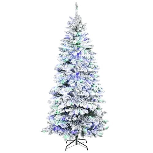 HOMCOM Sapin de Noël Artificiel 150 cm, Arbre de Noël Slim Lumineux floqué enneigé - Support en métal, lumière LED Blanc Chaud et 263 Branches - Effet réaliste, Vert