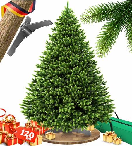 KESSER® Sapin de Noël artificiel 120 cm – comme un vrai – sapin de Noël naturel avec socle en bois + sac, branches denses, sans aiguilles, pin réaliste, arbre de Noël, vert foncé